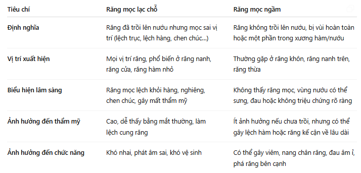 Điểm khác nhau giữa Răng mọc lạc chỗ vs Răng mọc ngầm