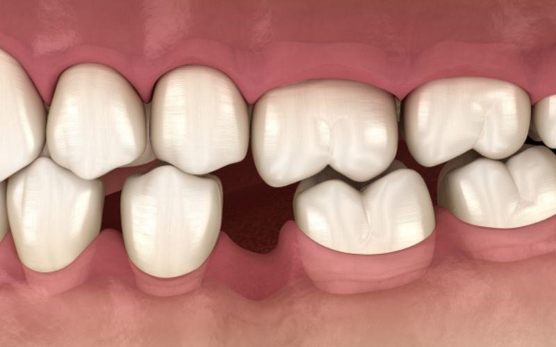- Về chức năng ăn nhai: tình trạng tiêu xương răng khiến xương hàm bị tụt thấp, hàm răng có xu hướng đổ về phía khoảng trống, khiến các răng kế cận răng bị mất bị xô lệch, có nguy cơ lung lay và gãy rụng cao. Đồng thời, tiêu xương hàm cũng dẫn tới tình trạng lệch khớp cắn, khiến người bệnh gặp khó khăn khi ăn nhai;